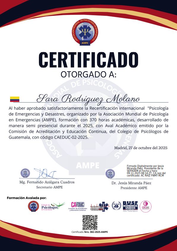 Psicóloga especializada en intervención en crisis y salud mental en emergencias, con amplia experiencia en contextos humanitarios y de alta vulnerabilidad. Me destaco por ofrecer una atención personalizada, humanizada y basada en protocolos actualizados, abarcando temas como conducta suicida, migración, diferentes tipos de violencias, maltrato infantil y apoyo psicosocial en situaciones críticas. Formadora reconocida y comprometida con la mejora continua, brindo acompañamiento integral para fortalecer el bienestar emocional de personas y comunidades en momentos clave de su vida, garantizando un apoyo profesional, sensible y empático.